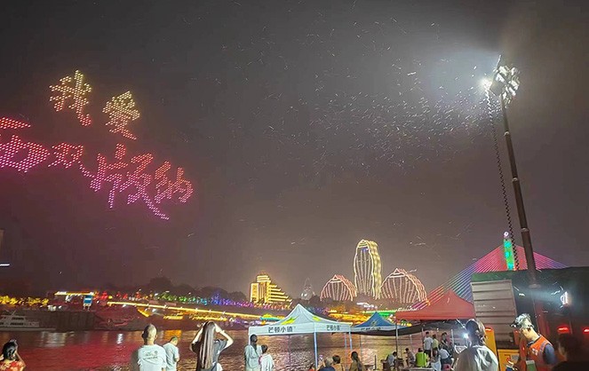 4月13日早晨,為保障龍舟比賽及夜間活動進行,支援小組克服了斜坡沙石踩滑、扛設備過江、船用設備調整等問題,將設備布置在了每一個需要的場所,龍舟比賽圓滿完成。4月13日晚,放飛孔明燈活動出現意外情況,尚為支援小組協助消防部門展開緊急救援,現場人流大、環境嘈雜,支援小組以最快的速度架起了一座應急燈塔,提供照明保障。